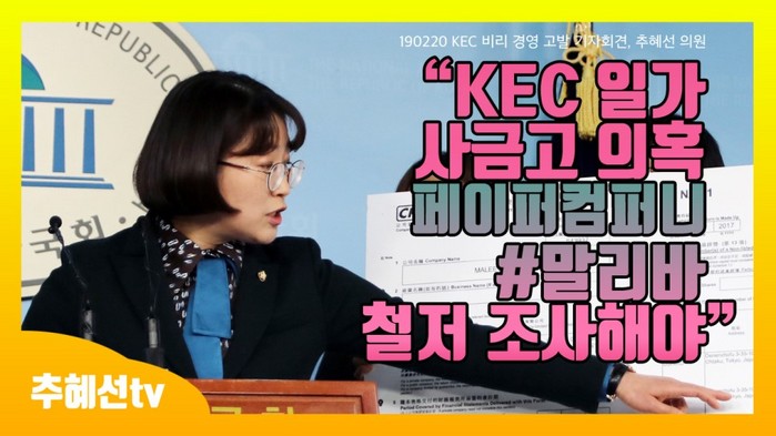 추혜선 의원은 KEC가 고액 단가를 책정해 지분관계도 없는 부품 공급사와 유통회사에 실적을 몰아주고, 굳이 중간유통사를 끼워넣어 이른바 '통행세'까지 지불했던 것은 그 정점에 있는 말리바를 통해 회사자금을 빼돌릴 의혹이 충분하다는 반증이다고 했다.