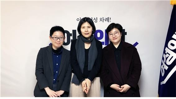 ▲여성의당 중앙당사에서 열린 중앙선거대책위원회 출범식에서 기념촬영을 하고 있는 박보람 비례대표 후보, 최영미 시인, 이지원 비례대표 후보) |