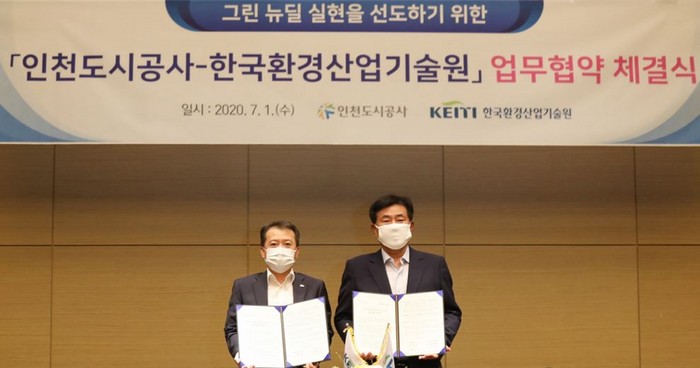 KEITI 한국환경산업기술원(원장 유제철)은 7월 1일 인천 연수구 홀리데이 인 인천 송도 호텔에서 인천도시공사(사장 이승우)와 인천지역 그린뉴딜 실현을 선도하기 위한 업무협약을 체결했다.