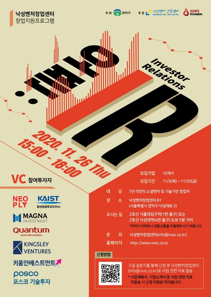 그 성과의 일환으로 낙성벤처창업센터가 오는 26일(목), 지난 8월에 이어 7년 미만의 소셜 벤처 및 기술기반 창업자를 위한 제2회 'OPEN IR(Investor relations)'행사를 개최한다고 밝혔다.