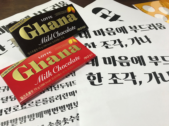 '가나초콜릿체'는 젊은 감성과 입 속에 넣었을 때 느껴지는 부드러운 느낌을 살렸다. '가나초콜릿체' 글꼴에 약 3도의 미세한 기울기를 줬고 곡선의 미를 살려 시각적으로 편안함과 부드러움이 느껴질 수 있도록 만들었다.