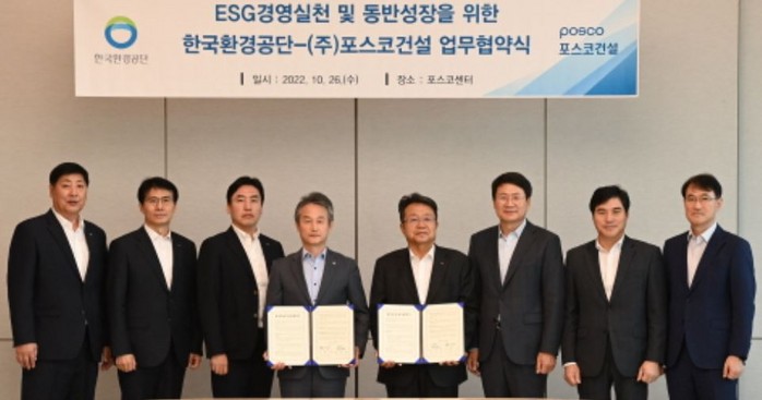 한국환경공단(K-eco)은 26일 ㈜포스코건설(사장 한성희)과 'ESG 경영실천 및 대·중·소기업 상생협력을 위한 동반성장 업무협약'을 체결했다.