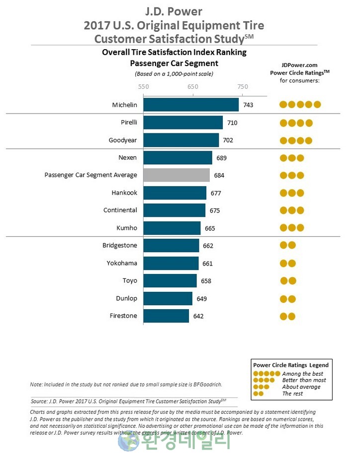 넥센타이어는 미국 JD Power가 실시한 2017년 신차용 타이어 고객만족도 조사 승용차 부문에서 12개 타이어 브랜드 중 4위를 차지했다고 17일 밝혔다.