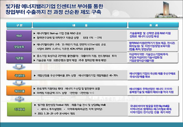[환경데일리 온라인팀] 한국전력(사장 조환익)이 빛가람 에너지밸리를 글로컬(Glocal) 창조경제 혁신구역으로 육성하기 위하여 에너지밸리에서 창업하거나 이전하는 기업을 위하여 창업 또는 이전부터 수출에 이르는 전 과정을 지원하는 제도를 5월부터 시행한다고 밝혔다.