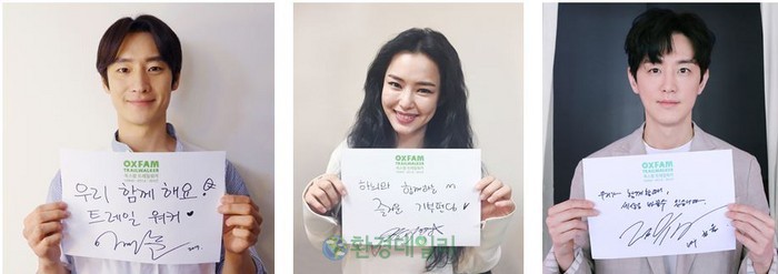배우 이제훈과 이하늬, 권율이 사람엔터테인먼트 인스타그램에 '옥스팜 트레일워커' 기부펀딩을 독려하는 친필 메시지가 담긴 사진을 깜짝 공개했다.