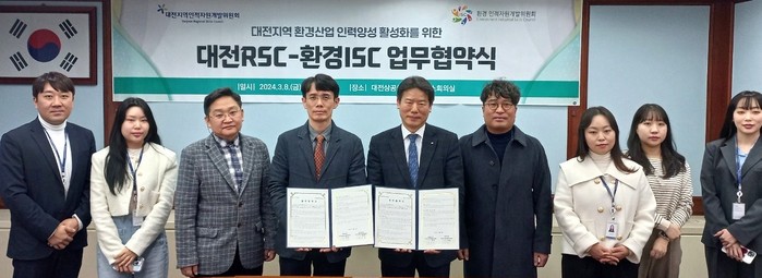 이와 관련해서 환경인적자원개발위원회(환경 ISC 위원장, 진광현 한국상하수도협회 상근부회장)와 대전지역 인적자원개발위원회(대전 RSC, 위원장 정태희 대전상공회의소 회장)는 8일 대전상공회의소에서 '환경 ISC-대전 RSC 업무협약'을 체결했다.