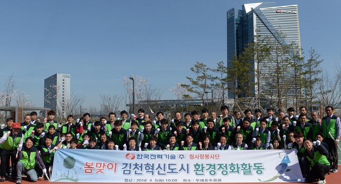 한전기술 박구원 사장을 비롯한 임직원 70여명은 오전 10시부터 12시까지 회사 주변 우래호수공원 일대에서 담배꽁초, 캔 등 오물 과 쓰레기 수거 활동을 펼쳤다.