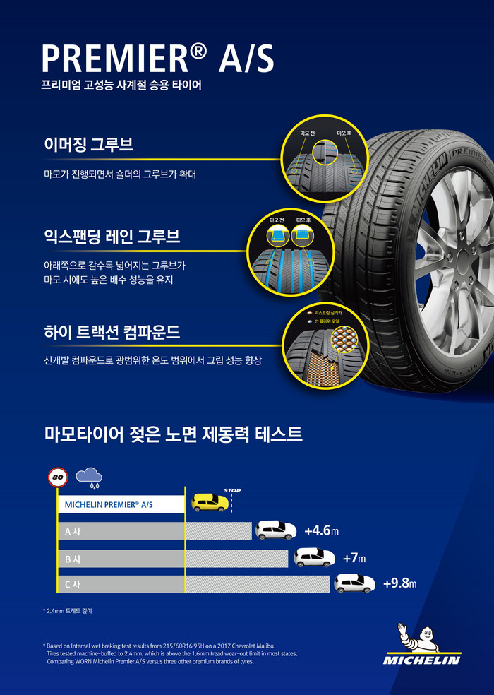 이와 함께 출시된 사계절 타이어 '미쉐린 프리미어 A/S'는 미쉐린의 '프리미어 패밀리'세단용 타이어로, 기존 SUV용으로 출시된 프리미어 LTX의 성능을 그대로 담고 있다. 미쉐린만의 특허기술인 '에버그립(EverGrip)'이 적용돼 타이어가 마모될수록 트레드의 그루브가 넓어져 처음부터 끝까지 동일하게 우수한 성능을 발휘하며, 실리카, 해바라기씨 오일 등 합성소재로 제작돼 젖은 노면 위에서의 안전성과 어떤 환경에서도 탁월한 유연성을 자랑한다.