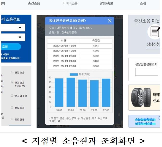 기존에 총괄표로 된 문서형태로 제공하는 방식에서 지도상의 소음진동 측정망 지점별로 검색할 수 있도록 개선해 빠르고 편리하게 지역별 소음정보를 확인할 수 있도록 했다.