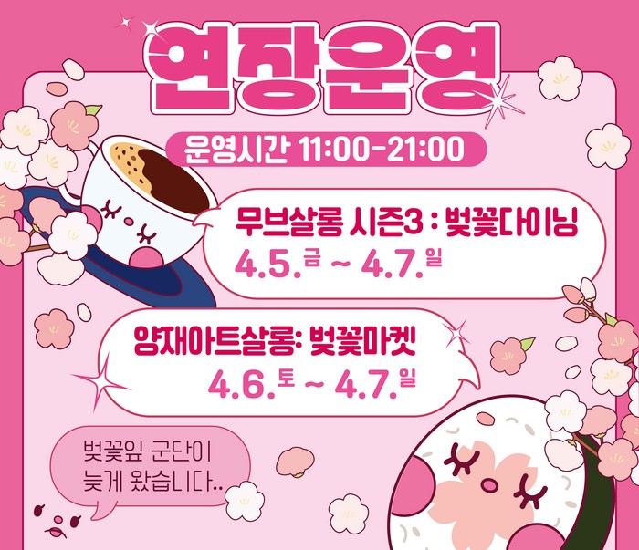 서울 서초구는 벚꽃 개화 시기가 늦춰짐에 따라 당초 3월 31일까지 예정됐던 '양재아트살롱 벚꽃마켓'을 6~7일까지 연장 운영한다.