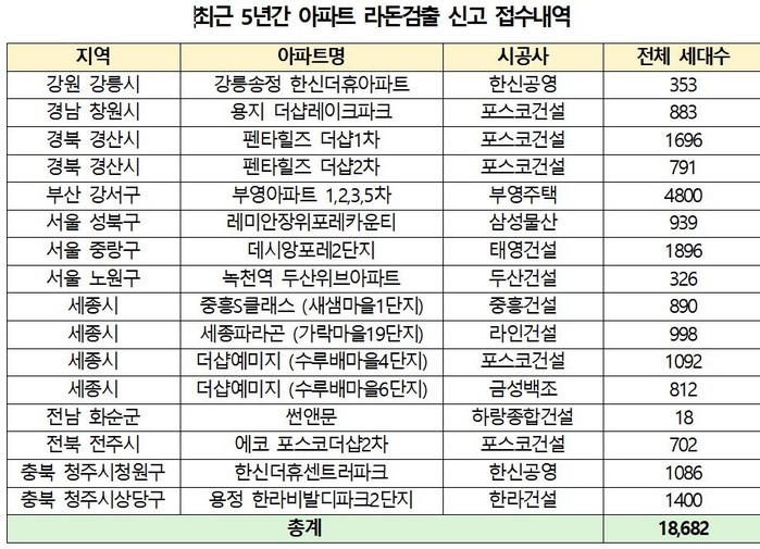 전국 아파트 18,682세대서 라돈검출 신고 접수