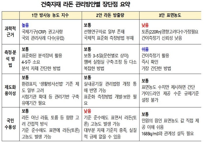 그러면서 "정부가 결론을 내지 못한다면 20대 국회가 끝나기 전에 국회가 결단하여 전문가들이 추천한 '방사능 농도 지수'를 기준으로 라돈 방출 건축자재 사용을 금지하는 법을 통과시켜 국민들의 불안을 해소하는 것도 방법"이라고 주장했다.