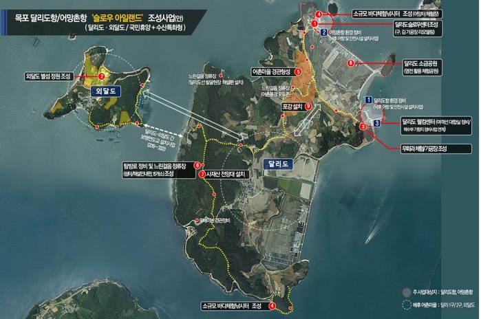 시는 달리도항과 어망촌항을 중심으로 배후의 마을을 느린 어촌의 삶과 아름다운 섬 풍경을 테마로 한 '슬로우 아일랜드'로 재생하고 국민 휴양섬으로 명소화하는 것을 목표로 하고 있다.