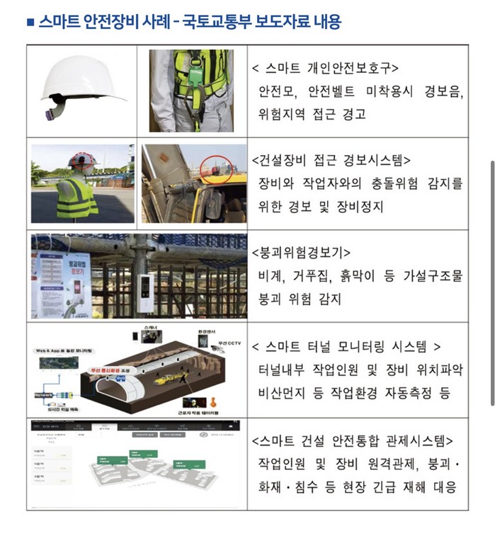 | ▲환경공단 사업장에서 적용하고 있는 국토부에서 권장하고 있는 스마트 안전장비 현황 |