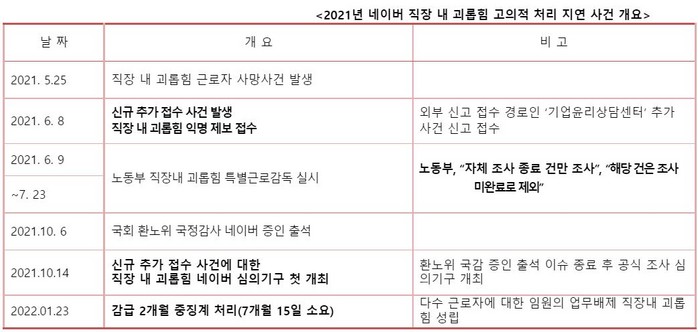 지난해 직장 내 괴롭힘 네이버 근로자 사망 사건 이후 고용노동부의 특별근로감독이 실시되기 하루 전에 익명의 제보가 외부 경로로 신규 추가 접수됐다.