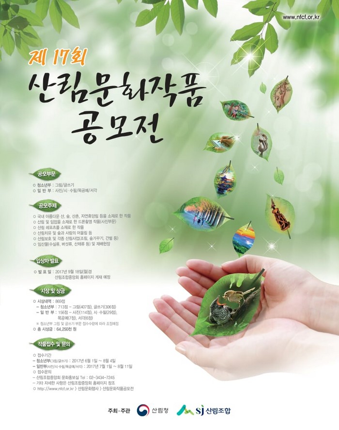 매년 1만점 이상 접수되고 있는 산림문화작품공모전은 청소년부(그림/글쓰기)와 일반부(사진/시·수필/목공예/서각)로 나눠 접수하며 접수는 청소년부(그림/글쓰기) 6월 1일부터 8월 4일까지, 일반부(사진/시·수필/목공예/서각) 7월 1일부터 8월 11일까지이다.