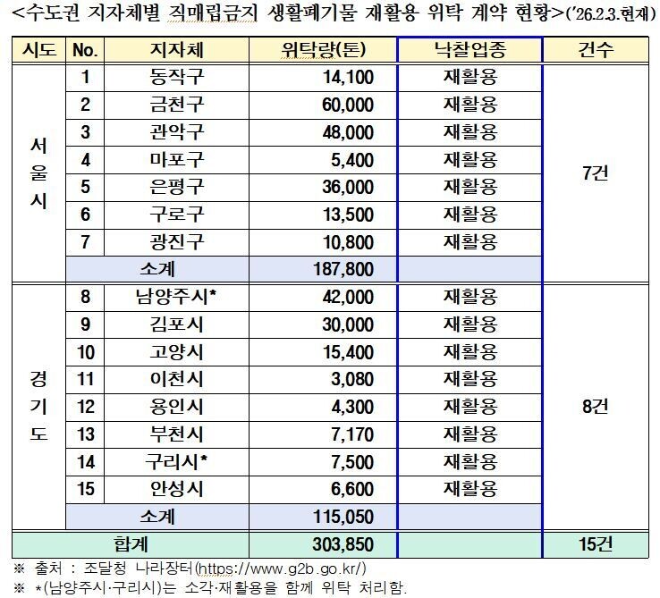 이중 민간소각시설로 28건, 42만1603톤이 계약됐고, 재활용업체로는 15건, 30만3850톤이 계약됐다. 경기 남양주시와 구리시 등 2개 지자체는 민간소각시설과 재활용업체 모두와 계약해 건수는 43건을 기록하고 있다.