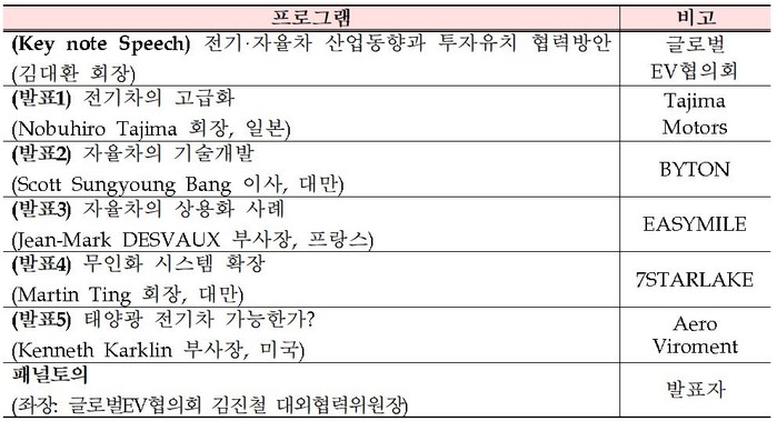 이 자리에서 ▲미국 Aero Viroment 태양광 전기차 ▲프랑스 EASYMILE 자율차 상용화 사례 ▲일본 Tajima Motors 전기차의 고급화 ▲중국 BYTON 자율차 기술개발 ▲대만 7StarLake 무인화 시스템 확장에 대해 기업별로 주제발표가 진행했다.
