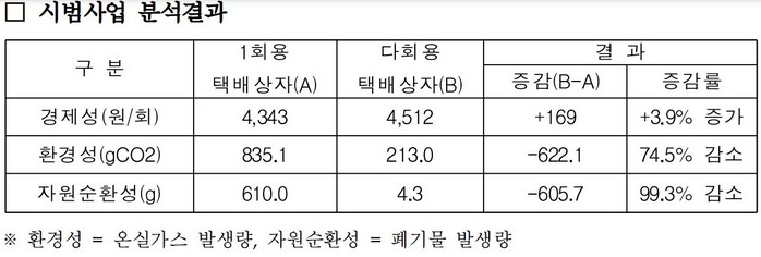 환경부는 실증 조사 자료를 바탕으로 1년간 다회용 택배상자를 사용하는 것으로 가정해 자료를 분석한 결과, 경제성은 조금 낮으나, 환경성과 자원순환성은 우수한 것으로 예측했다.