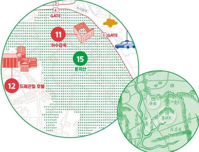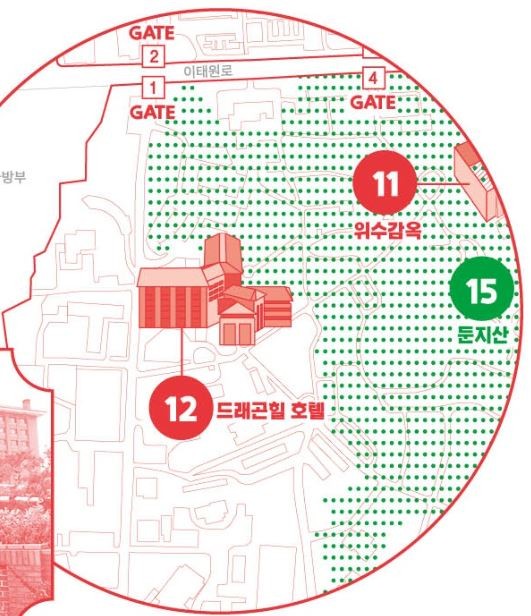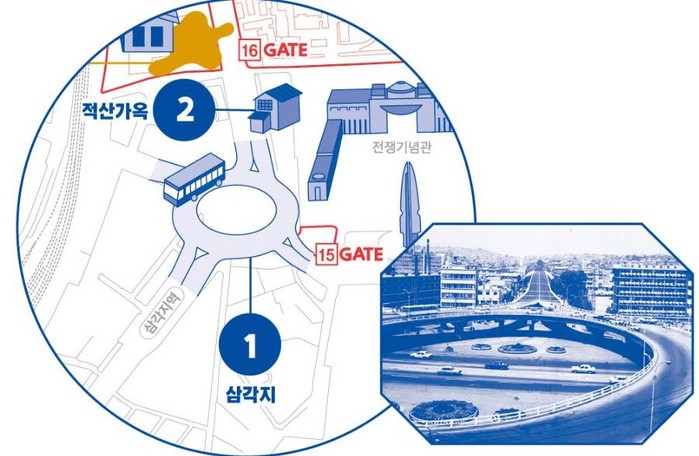 전쟁기념관 옆에는 일본식 잔재물 적산가옥들이 있었다. 주변에 캠프킴을 비롯해 군사독재의 치욕적인 만행이 있었던 남영동 대공분실, 이태원 넘어로 해방촌, 지금도 있는 아이랑택시, 남일당 등이 있다.
