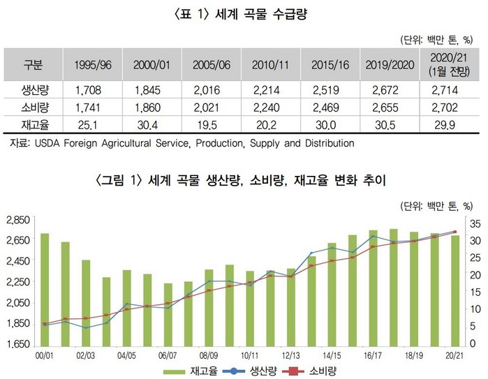 국제곡물위원회(IGC)는 세계 곡물 생산량을 2020/21년 900만 톤 감소한 22억 1000만 톤으로 전망했고, 시즌 소비량 전망치도 하향 조정했다. IGC는 옥수수에 대한 전망을 1300만 톤으로 줄였는데, 이는 밀 전망의 상향 조정에 의해 부분적으로 상쇄됐다.
