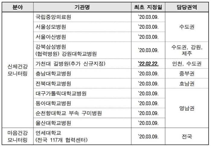 국립환경과학원은 2018년부터 가습기살균제 노출로 인한 건강피해의 장기적 관찰 및 의료지원·상담을 목적으로 하는 건강모니터링 사업을 진행하고 있으며, 이번 가천대 길병원을 포함해 총 12곳의 기관을 보건센터로 지정·운영하고 있다. 현재 신체건강 모니터링 11곳, 마음건강 모니터링 1곳(전국 117개 지역 상담소 포함)이다.