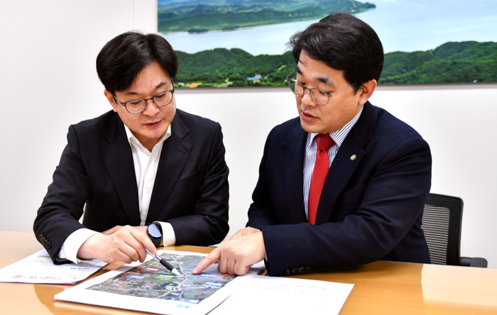 ▲김병수 김포시장(사진 왼쪽)과 배준영 의원이 만나 인천에서 강화가는 길을 내기위한 합의했다. |