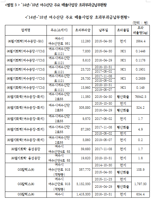 GS칼텍스는 황산화물/먼지를 4453kg 초과배출해 총 1040만원 납부했다. 금호석유화학 제1·2에너지에서 황산화물/먼지를 1583kg 초과 배출해 총 270만원, 이외 한화케미칼 여수1공장에서 염화수소를 7kg 초과 배출 70여만원을 납부했다.