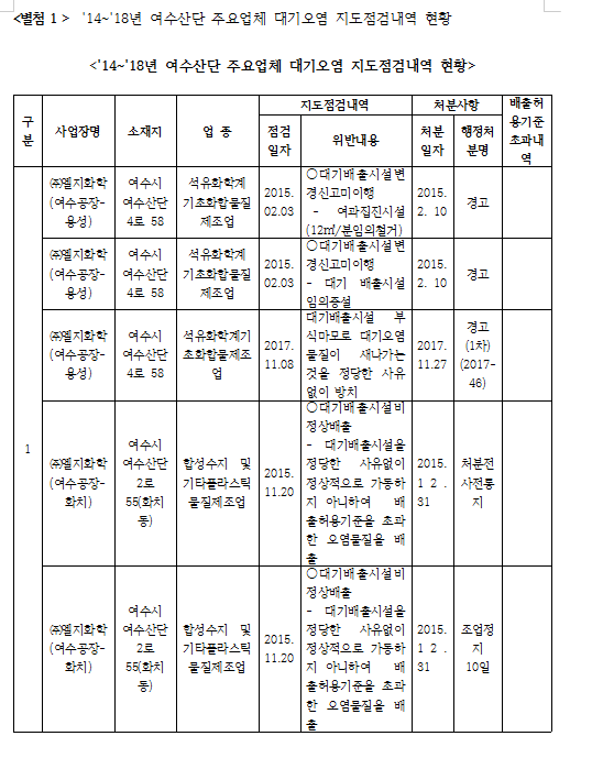 LG화학(여수공장-용성)은 2015년 대기배출시설 변경신고 미이행으로 경고조치를 받고 2017년 대기오염물질이 새는 것을 정당한 사유없이 방치했지만 경고에 그쳤다. 2015년 LG화학 여수공장은 염화수소가 누출돼 화학사고로 부상자 1명이 발생했던 곳이다.