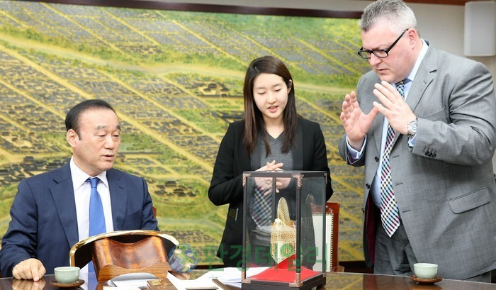 ▲예놉틱(Jenoptik)그룹의 마이클 멀틴 대표가 경주로부터 받은 기념품 처년의 고도 보물 신라왕관을 받고 설명을 듣고 있다. 왼쪽 앉은 이는 최양식 경주시장 |