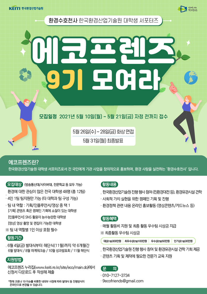 한국환경산업기술원(KEITI)은 기관 주요 사업을 국민에게 쉽고 친숙하게 안내하는 대학생 홍보단 '제9기 KEITI 서포터즈 에코프렌즈'를 5월 10일부터 21일까지 모집한다.