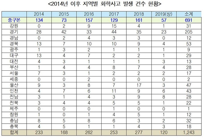 2014년 233건이던 화학사고는 2018년 277건으로 늘어나 증가하는 추이를 보이고 있으며, 지역별로는 경기(205건), 경북(53건), 울산(47건), 인천(43건) 순으로 높은 발생률을 보이고 있다.
