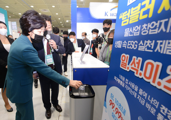 | ▲한화진 환경부 장관이 텀블러 살균세척기를 시연해보고 있다. |