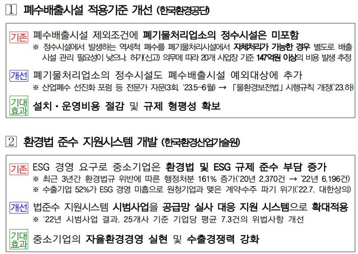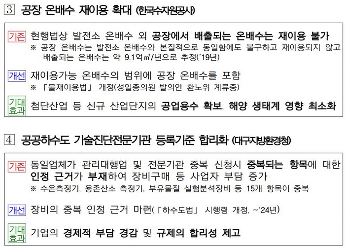 K-wate 수공은 기업의 탄소중립 이행 지원을 위해 그간 발전소에 한정됐던 온배수 재이용이 일반공장에서도 가능하도록 개선방안을 제시했다. 대구지방환경청은 사무실-실험실 소재지 일치 등 불합리한 공공하수도 기술진단전문기관 업무처리지침을 개정해 규제의 현장 적용성을 높이는 방안을 제시한다.