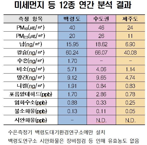 이 기간 동안 백령도 대기환경연구소의 총가스상 수은(세계보건기구 권고기준 1000ng/㎥) 평균 농도는 1.7ng/㎥으로, 수도권 지역인 은평구 불광동(1.3 ng/㎥)보다 다소 높게 나왔다.