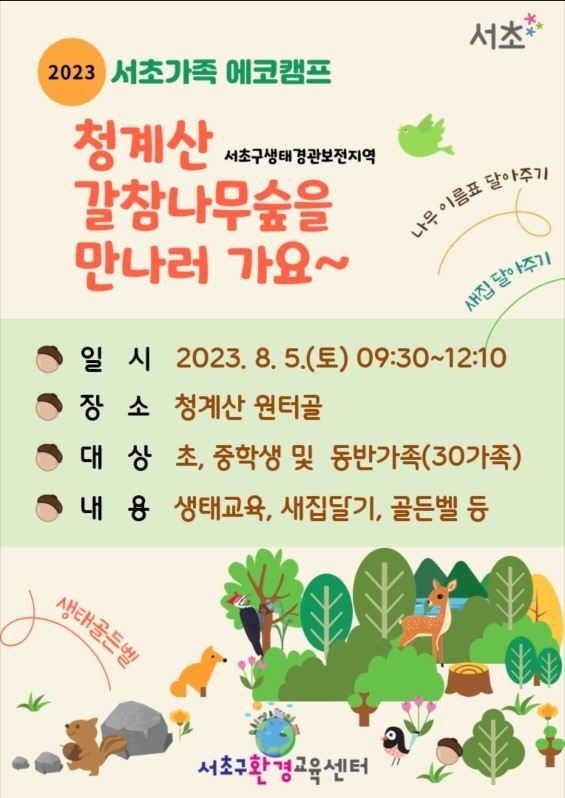 [환경데일리 이은주 기자]서울 서초구는 여름방학을 맞아 오는 5일 생태·경관보전지역인 청계산 원터골에서 체험형 환경교육 '서초가족 에코캠프'가 열렸다.
