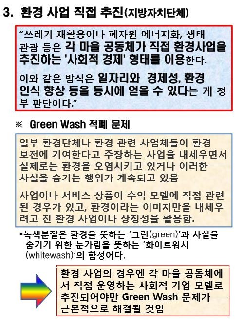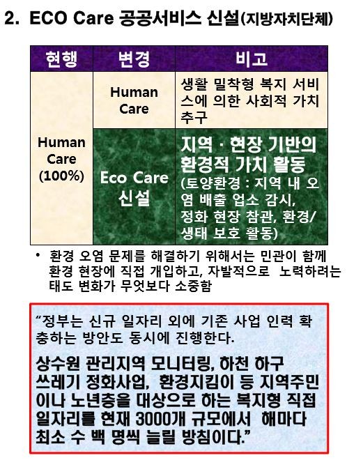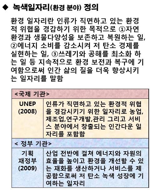환경일자리(Green job)문제의 해결은 국민의 안전을 확보하는 것과도 직결돼 있다고 입을 모으고 있다. 실제로 갈수록 국민들의 요구가 커진 환경 안전분야는 국민의 생명과 직결돼있어 폭넓은 일을 할 수 있는 민관 조직 확산이 요구된다.