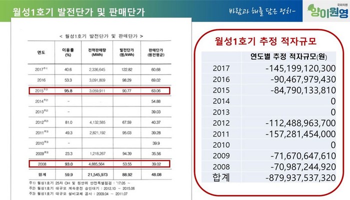 월성1호기 발전단가와 판매단가가 공개된 것은 이번이 처음이다. 의원실 분석에 따르면 지난 10년간 매년 적게는 700억원에서 많게는 1572억원 가량 적자로 운영된 것으로 추정된다.