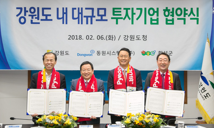 | ▲동원시스템즈 강원도 MOU 체결 (좌부터) 최문순 강원도지사, 박인구 동원그룹 부회장, 조점근 동원시스템즈 사장, 한규호 횡성군수 |