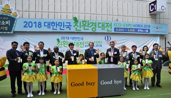 5일 오후 코엑스 C홀에서 마련된 2018친환경대전 개막식에 앞서, 박천규 환경부 차관, 이덕승 녹색소비자연대전국협의회 상임위원장, 그린카드의 대표 비씨카드 영업본부장 등이 유공자 수상자, 가족 등이 참석한 가운데 시상식을 가졌다.
