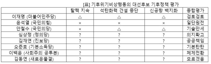 또한 시민들이 어느 때보다 기후위기에 큰 관심을 갖고 후보 선택을 고민하고 있음에도, 대선 구도와 분위기가 가십성 이슈 공방 위주의 혐오 대선으로 흐르면서 유권자의 선택에서 기후정책이 핵심적 기준이 되거나 세부 내용이 화제가 되고 있지는 못한 상황이다.