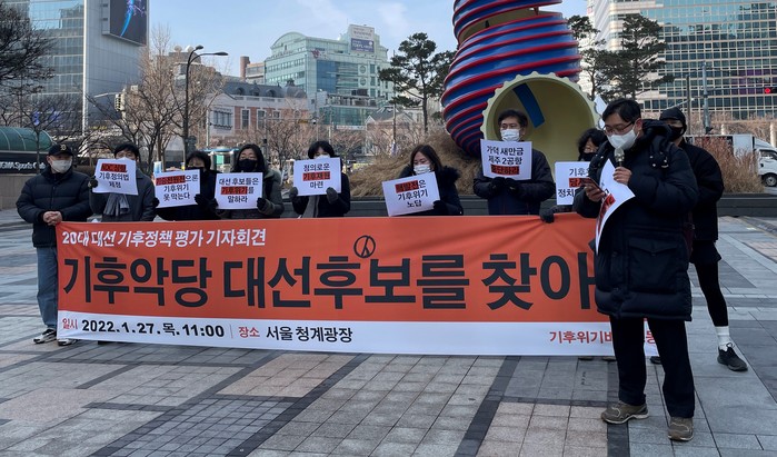 27일 오전 11시 서울 청계광장 앞에서 기후위기 문제의식 없는 저질 막장 대선에 대한 총평과 함께 주요 후보들의 기후정책 낙제점, 탈원전, 탈석탄, 신공항 찬반 결과, 기후악당 후보로 낙인찍힌 3명에 대한 경고, 마지막으로 기후위기비상행동의 기후정책 제안을 공개했다.