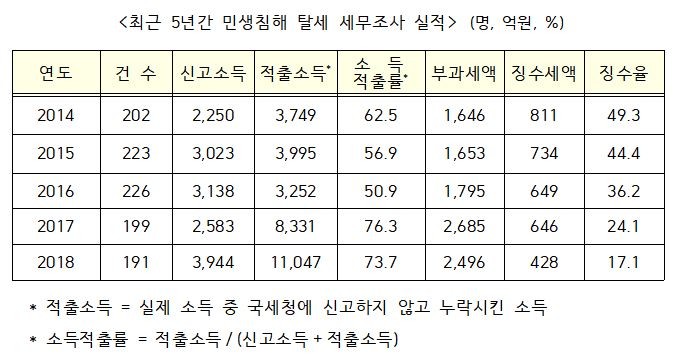 민생침해 탈세자의 소득탈루율(소득적출률)도 2014년 62.5%에서 2018년 73.7%로 5년 새에 11.2%나 증가했다.