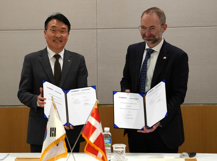 ▲덴마크 전력망 운영사 에네르기넷(Energinet)이 한국전력공사와 ‘지식 공유 및 협력 확대 업무 협약’에 서명했다. 서명식은 라스 아가드 덴마크 기후에너지유틸리티부 장관, 서철수 한전 부사장, 피터 마쿠센 에네르기넷(Energinet Associated Activities) CEO, 스벤 올링 주한 덴마크 대사 등이 참석했다 |
