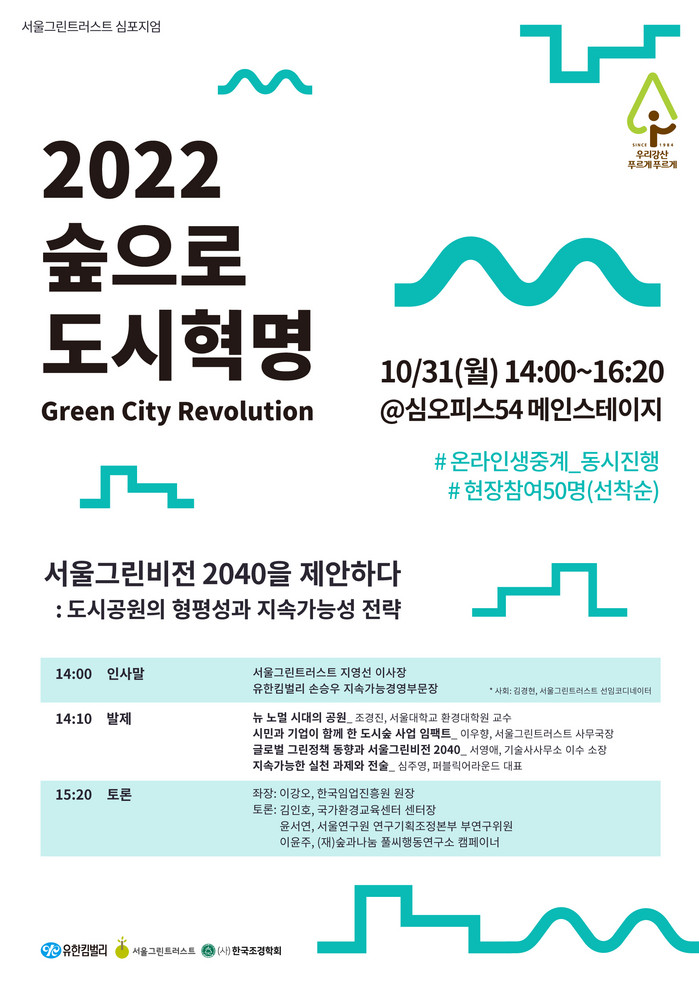 이강오 한국임업진흥원 원장이 좌장을 맡아 패널은 김인호(국가환경교육센터 센터장), 윤서연(서울연구원 연구기획조정본부 부연구위원), 이윤주(숲과나눔 풀씨행동연구소 캠페이너)가 참석한다. 사전 신청은 온라인 페이지로 가능하다. 온라인 참여의 경우, 사전 신청자를 대상으로 행사 당일 생중계 링크를 개별 발송할 예정이다.