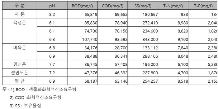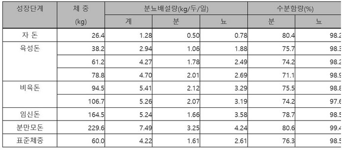 | ▲ 돼지 성장단계별 분뉴배설량 및 수분함량표 |