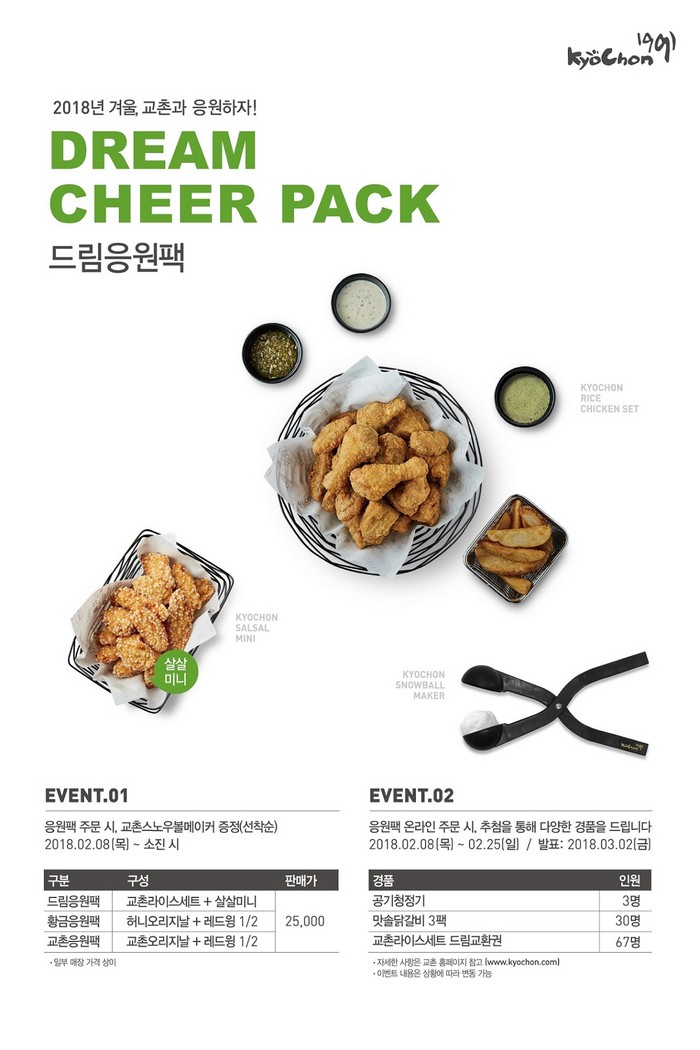 교촌 홈페이지를 통해 응원팩을 주문하고 응원 메시지를 남기면 추첨을 통해 총 100명에게 '공기청정기(3명)', '맛솔 닭갈비(30명)', '교촌라이스세트 드림교환권(67명)'을 증정한다.