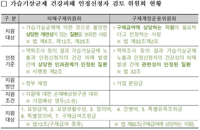 가습기살균제 피해구제를 위한 특별법에 따라 건강피해 미인정자 지원 등을 전문적으로 검토하기 위해 설치된 위원회, 구제급여 상당지원, 긴급의료지원, 원인자 미상, 무자력 피해자 추가지원 등 3개 위원회가 있다.