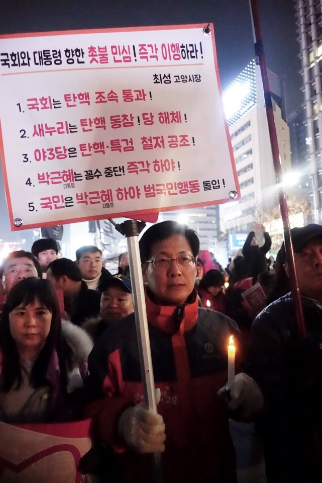앞서 최 시장은 그동안 전국적으로 열린 여섯 차례의 박근혜 대통령 퇴진 범국민행동 촛불집회에 참가 자유토론 등을 통해 박근혜 대통령의 퇴진과 탄핵, 나아가 대한민국 시민 민주주의의 승리를 위한 자치단체장들의 적극적 참여와 초당적 연대를 꾸준히 주장하며 촛불집회에 참석한 시민들의 적극적인 호응을 받아왔다.