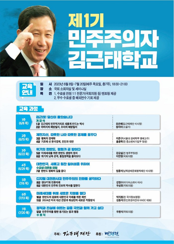 [환경데일리 김영민 기자]리더십 교육과 김근태 평화와 상생 위한 한반도재단(김근태재단)이 주최하고 경제민주화와 평화통일을 위한 국민연대(민평련)가 후원하는 제1기 '민주주의자 김근태학교'가 8일 개강한다.